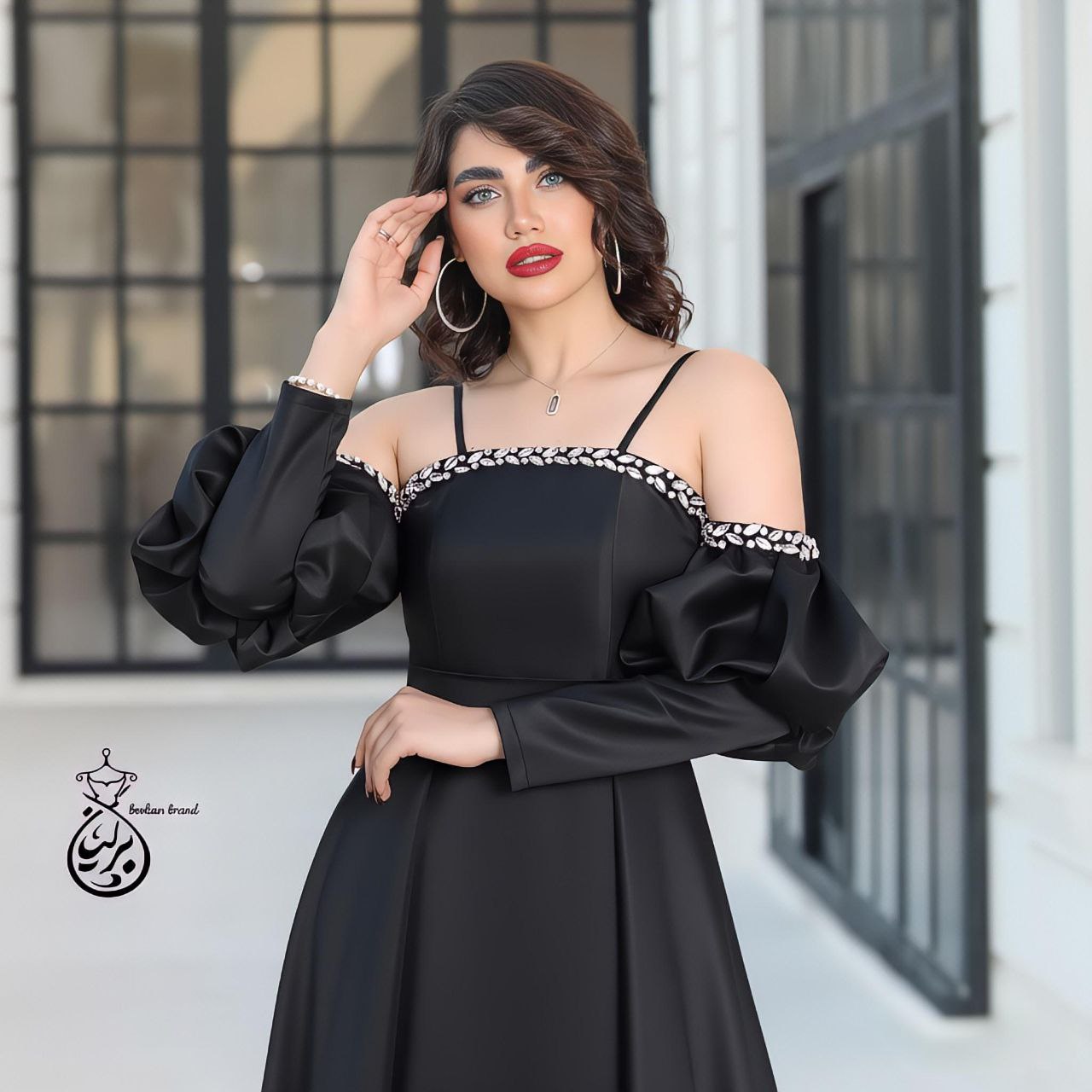 پیراهن مجلسی زنانه قواصی با خرجکار ساتن کار دیزاین شده با سنگ دوزی مدل آرالیا